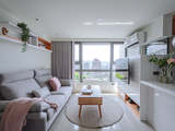 作品介绍- 小空间大延伸 这是栋挑高四米五的室内空间,位居高楼层,放眼望去,採光及视野都非常好。挑高的夹层屋可以当两个楼层使用,由於一个楼层的面积只有26平方米,需要容纳一家四口,设计师运用巧思,在规划上使用白色系并在玄关墙面使用茶镜,让一楼公共空间有放大作用。 夹层屋的一楼规划成公共活动空间
